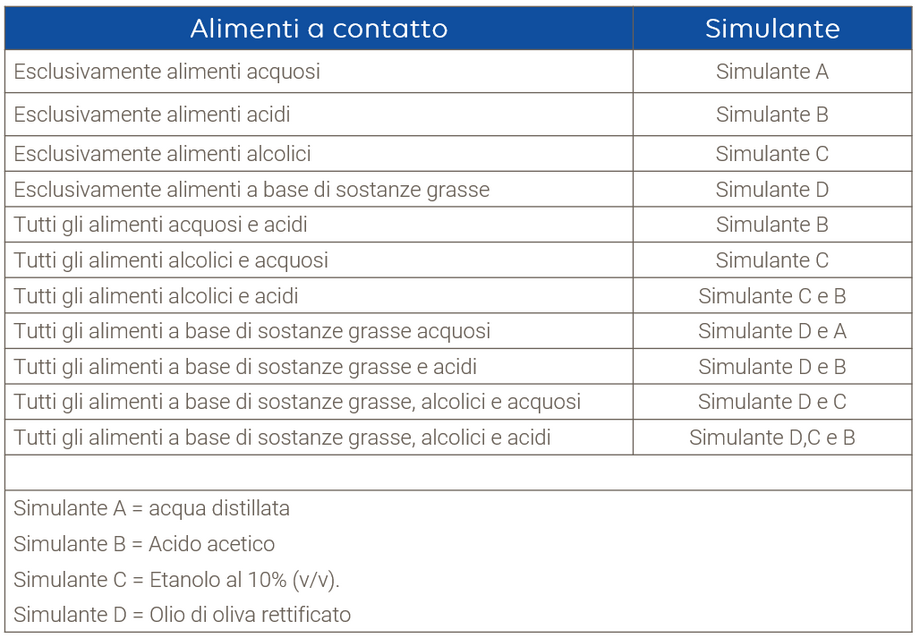 - Per un materiale destinato ad entrare in contatto con tipi di alimenti specifici, i test devono essere realizzati con i simulanti che seguono